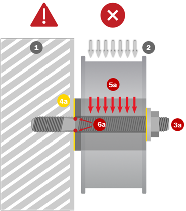 - Dadurch entsteht eine Scherwirkung, die zum Versagen des Befestigungselements führen kann. (6a)