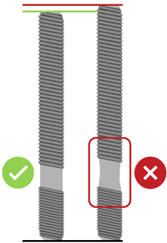 - Ein Befestigungselement in gutem Zustand und ein Befestigungselement, das zu stark angezogen wurde, die Elastizitätsgrenze überschritten hat und in die Plastizitätsgrenze eingetreten ist, so dass es nicht mehr in seine ursprüngliche Länge zurückkehren kann. (siehe Zustand des Befestigungselements).