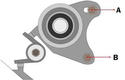 - Die Schraube B dient als Drehpunkt, damit sich die Einstellplatte drehen und die richtige Spannung aufbringen kann.