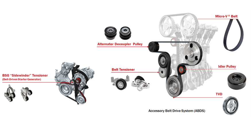 All the components such as air conditioning pump, power steering pump, water pump, start-stop system of Accessory Belt Drive System in modern vehicles are under extreme stress, due to technologically, hybridization and engine complexity. The accessory belt drive system is a Power transmission with recovering and extra boost in energy via starter