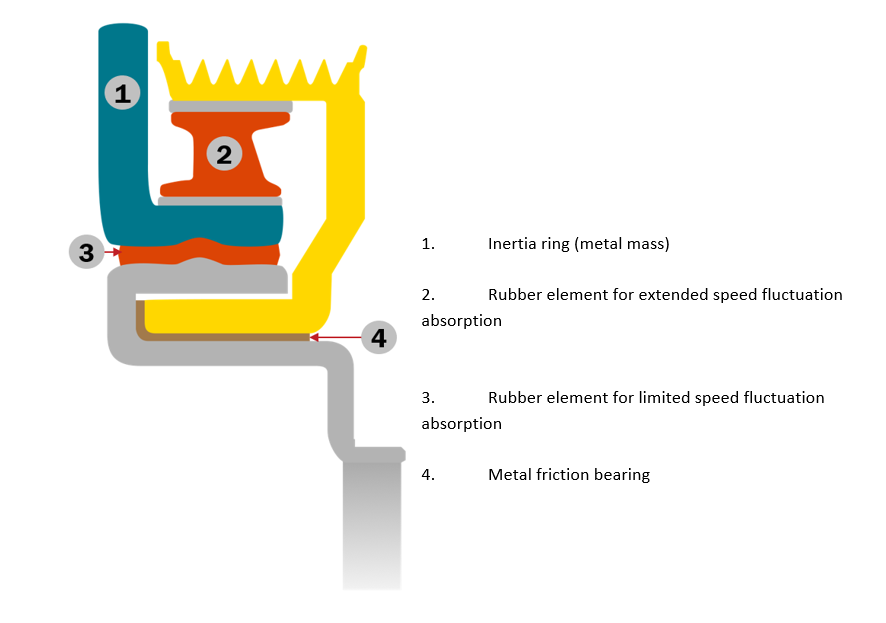 Most of the TVD's have a rubber part which is the best ally to counteract the first-degree harmonics which are the ones that can affect the engine components the most, also the dampers that require it, have an inertia mass in charge of absorbing other types of harmonics which are also important.