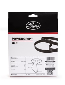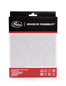 Gates PowerGrip® timing belts are always supplied in individual packaging. The packaging is made of sturdy cardboard, featuring a clean design with a clear logo, images, and legible text. You'll find these belts in three primary packaging colors: red, black, and white.