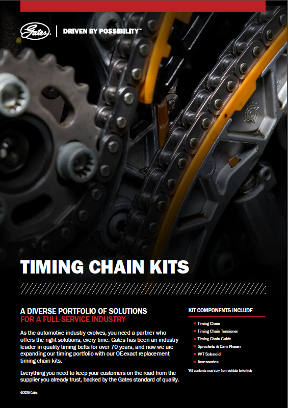Distributors are now able to offer their independent garage customers Gates-branded timing drive kit solutions for belts and chains. Gates Timing Chain Kits will be sold alongside Gates PowerGrip Kits for timing belt drives. Micro-VÒ Kits for accessory belt drive systems complete the available drive system kits portfolio.