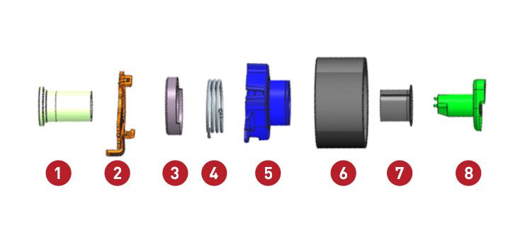 Componentes del tensor: 1: Manguito - 2: Platina base - 3: Espaciador de centrado - 4: Resorte - 5: Brazo - 6: Conjunto del rodamiento de la polea - 7:  Casquillo - 8: Ajustador.