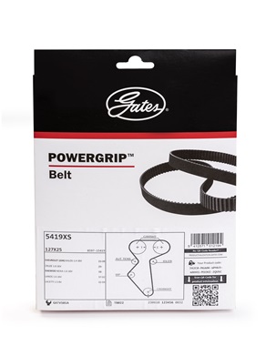 Las correas de distribución PowerGrip® de Gates se suministran siempre en embalajes individuales. El envase es de cartón resistente y presenta un diseño limpio con un logotipo claro, imágenes y texto legible. Encontrará estas correas en tres colores principales de embalaje: rojo, negro y blanco.