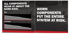 En un sistema ABDS existen muchos componentes móviles, fabricados individualmente pero diseñados para funcionar juntos como un sistema. El rendimiento del sistema de transmisión por correa de accesorios depende del buen funcionamiento de cada componente trabajando de forma conjunta (7.) Estos componentes son piezas de desgaste. Los componentes de la transmisión se desgastan aproximadamente al mismo ritmo. (8.) Gates recomienda cambiar siempre las correas acanaladas y los componentes metálicos al mismo tiempo.