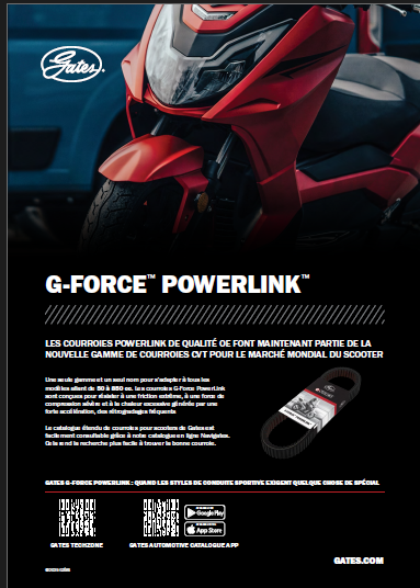 Les courroies G-Force PowerLink sont conçues pour résister à une friction extrême, à une force de compression intense et à la chaleur excessive générée par les fortes accélérations, des mouvements de va-et-vient fréquents et des charges lourdes. Le vaste catalogue de courroies pour scooters de Gates est facilement consultable grâce à notre base de données de catalogues en ligne Navigates. Cela vous permet de trouver facilement la Courroie qui vous convient.