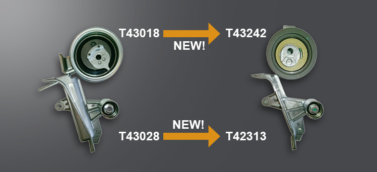 Plus précisément : en réalité, le dispositif de tension hydraulique, composé d'un galet tendeur T43018 et d'un amortisseur de vibrations T43028, a été remplacé par un nouveau dispositif de tension mécanique, composé d'un galet tendeur T43242 et d'un nouveau support de galet enrouleur T42313.