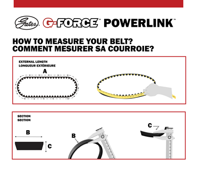 Ces courroies sont conçues pour résister à des frottements extrêmes, à une force de compression élevée et à une chaleur excessive créée par une accélération élevée, un rétrogradage fréquent et des charges lourdes. Elles sont réalisées selon trois conceptions différentes afin de garantir qu'une courroie G-Force Powerlink est disponible pour chaque secteur du marché.