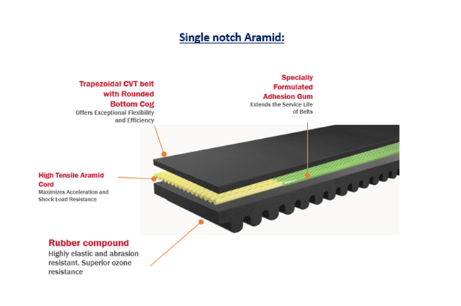 Pour les moteurs de plus de 100 cc, Gates recommande d'utiliser des courroies CVT renforcées avec un composé de caoutchouc renforcé d'aramide et des éléments de traction extra-forts en aramide pour maximiser l'accélération, la résistance aux chocs et la durée de vie.
