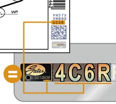 Con una lente d'ingrandimento, verificare che il codice di 10 cifre appaia sotto il logo Gates. Le ultime quattro cifre del codice di 10 cifre corrispondono al codice di sicurezza e anche alle ultime quattro cifre del codice alfanumerico.