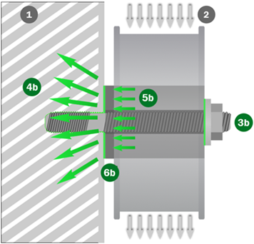 - Il carico della cinghia (2) viene trasferito direttamente sul codolo del dispositivo di fissaggio. (5a)