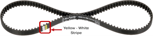 Gates NEW Belt-In-Oil riemen hebben een gele en witte streep op de achterkant van de riem. Deze strepen zijn nodig voor de productieprocessen van Gates. Let op, de strepen hebben niets te maken met de installatie (het is GEEN TIMING MARK !!!!).