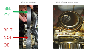 Als het gereedschap over de riem loopt zoals te zien is (afbeelding 1), is de riem niet opgezwollen. Maak van de gelegenheid gebruik om het uiterlijk van de riem te inspecteren, zoals eerder besproken. Controleer bovendien het smeersysteem op verstoppingen in de olie-opneemzeef en de zeef van de vacuümpomp. Inspecteer de VVT-magneetkleppen, de toevoerleidingen/afsluitingen voor de turboolie en de oliefilters.