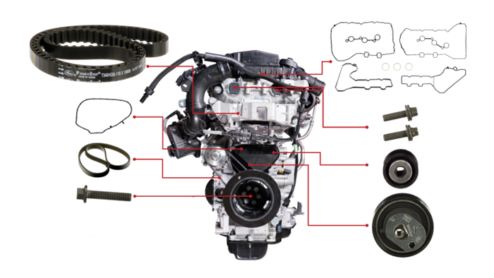 K03T360HOB K08T360HOB'yekadar Gates KitleriPureTech motorlar için özel olarak tasarlanmış süper kitlerdir. Bunlar, doğal emişli (NA) motorlar ve turboşarjlı motorlar için seçenekleri içerir. Aşağıdaki resim, motorun tipik düzeninin süper kit bileşenleri göstermektedir.